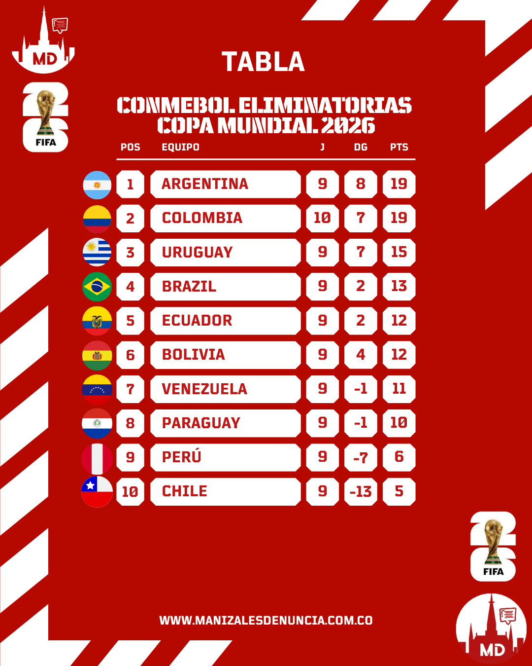La Selección Colombia vuelve a ganar en las Eliminatorias Sudamericanas rumbo al Mundial de Estados Unidos - México - Canadá 2026. Tras la fecha 10, el equipo nacional se mantiene en los primeros puestos de la tabla de posiciones con 19 puntos, y ya le sacó una diferencia de cuatro puntos a Uruguay, que es tercero.